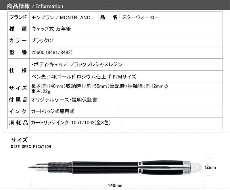 【ブランド】 ・モンブラン MONTBLANC 【種 類】 ・キャップ式万年筆 【仕 様】 ・ボディ:ブラックプレシャス・レジン ・ペン先:14 Kゴールド製ペン先、ロジウム仕上げの象嵌 【イ ン ク】 ・カートリッジ専用式 【カ ラ ー】 ・ブラックCT 【型 番】 ・25600(8481/8482) 【サ イ ズ】 ・長さ:140mm(筆記時150mm) ・最大胴軸径:約12mmφ ・重さ:約22g 【付 属 品】 ・MONTBLANC純正ボックス・国際説明書(ご購入より2年) 【消 耗 品】 ・カートリッジインク:1051/1062(全8色) 【商品説明】 「スターウォーカー」は、現代的なスタイルに伝統的な技巧を融合したものです。