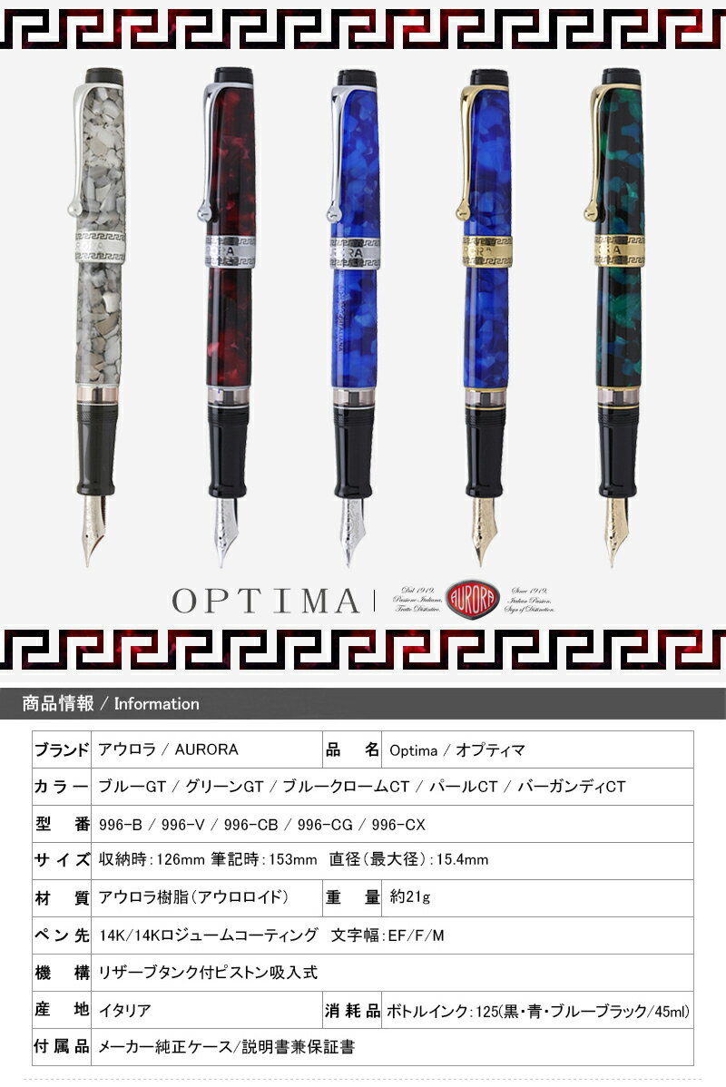 名入れ 万年筆 アウロラ AURORA オプティマ 名入れ 万年筆 グリーン 14金 EF/F/Mサイズ ブルーGT/996-B グリーンGT/996-V ブルークロームCT/996-CB パールCT/996-CG バーガンディCT/996-CX ギフト お祝い 文房具 名前入り 名入り