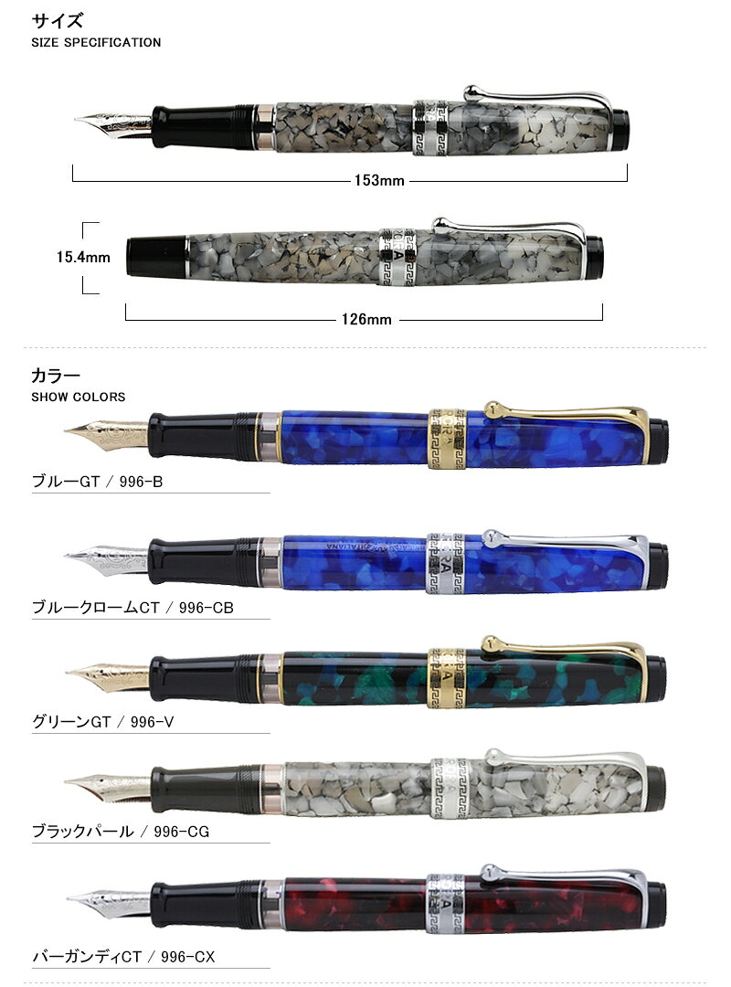アウロラ特製のアウロロイド樹脂を使用し、リングには、古代ローマ時代のグレカ・パターンが、ボディにはアウロラ社の創業当時の社名が刻印されています。